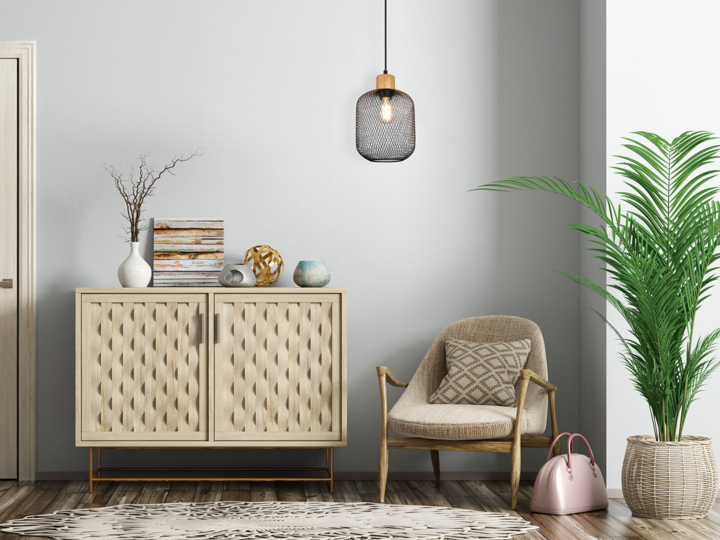 A luminária suspensa CALIMERO pode fazer mais do que apenas pendurar! A mistura moderna de materiais cria um ambiente elegante e acolhedor. Os vários pequenos recortes no abajur criam um padrão de luz e sombra que proporciona um toque de iluminação decorativa na sua casa. A luz pendente fica melhor na sala de jantar ou na sala de estar, por cima da mesa, num corredor alto ou numa escada com uma escada em espiral. O abajur é feito de uma persiana metálica em preto mate e, juntamente com os pormenores em madeira, cria um aspeto vintage moderno. Para uma iluminação economizadora de energia, recomenda-se a utilização de uma lâmpada LED. Estas são uma óptima alternativa às lâmpadas de halogéneo convencionais e representam uma elevada qualidade de luz e uma poupança de energia de até 80%. Além disso, as lâmpadas LED ajudam-no a beneficiar de uma longa vida útil, de uma baixa produção de calor e, ao mesmo tempo, protegem o ambiente.