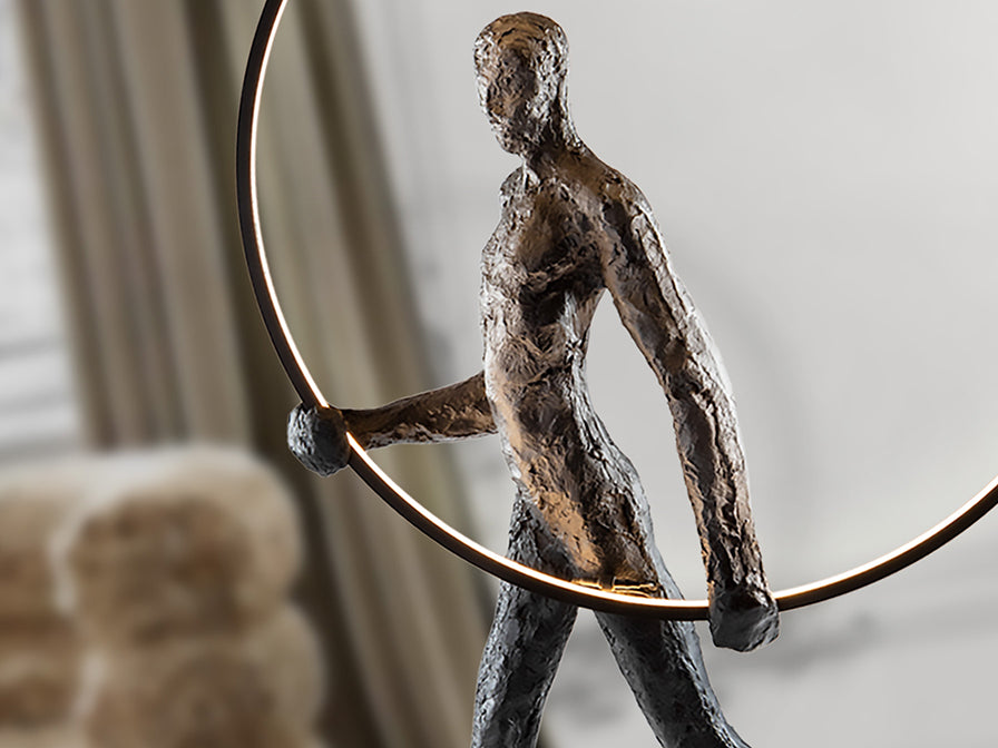 Figura realizada em fibra de vidro e resina de poliéster, acabamento preto mate. Aro de metal com luz LED. 3.30 W LED, 370 lm, 3000 k.