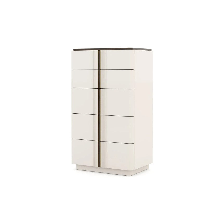 Neste Camiseiro destacamos o tampo em eucalipto, que lhe dá um toque de sofisticação e naturalidade, criando um contraste visual atraente. Com cinco gavetas espaçosas, esta peça oferece uma ampla capacidade de armazenamento para roupas, acessórios e outros itens pessoais. O detalhe em dourado no centro das gavetas adiciona um toque de requinte e elegância, tornando este móvel uma escolha única e distinta. A combinação dos materiais que constituem esta peça fazem dela um elemento visualmente notável.