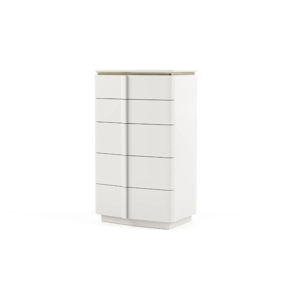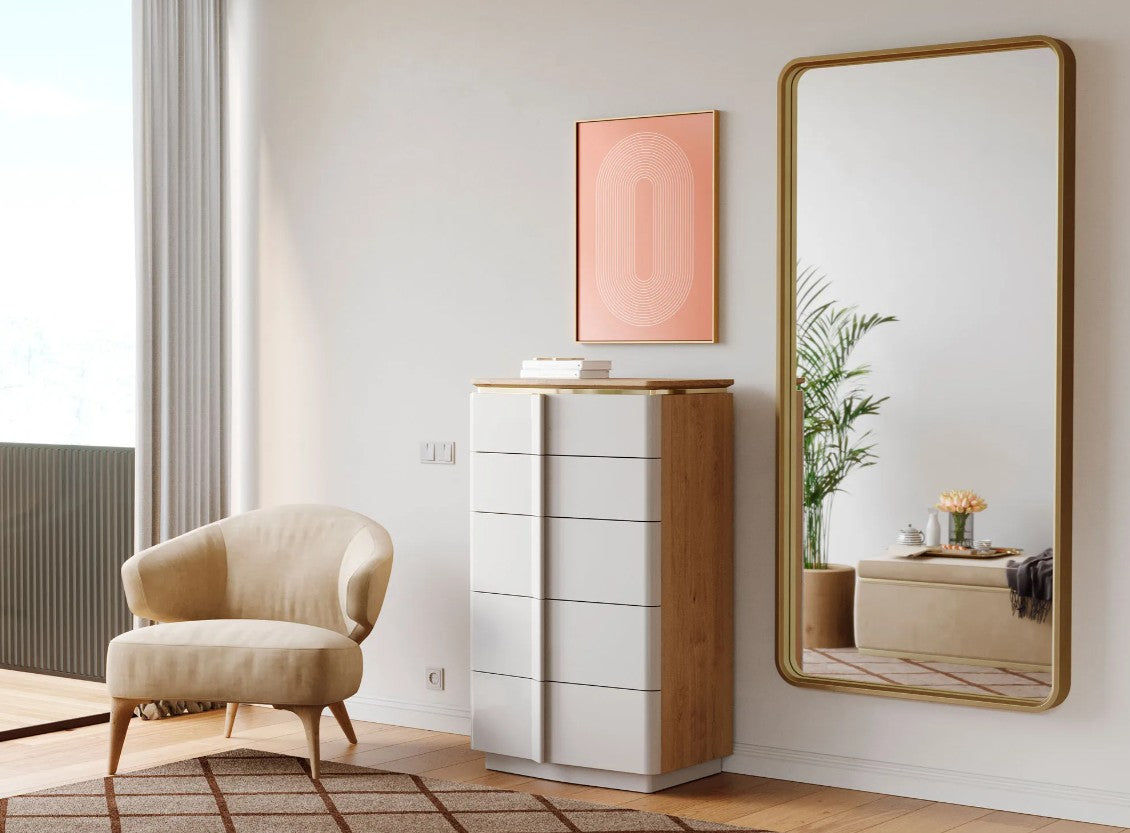 Camiseiro branco e com um pequeno detalhe em dourado, composto por cinco gavetas e com um amplo espaço para guardar as suas roupas e calçado. Os materiais podem ser personalizados de acordo com as suas preferências.