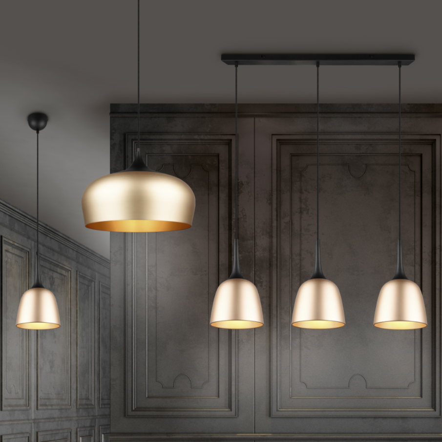 Forma clara, cor excitante! Os candeeiros pendentes da série CHIRON exalam elegância e um toque muito especial! A luminária pendente é feita de alumínio e é ideal para fins decorativos e práticos. Fica particularmente bem por cima da mesa de jantar ou numa área de entrada com tectos altos. A moderna combinação de cores preto-latão mate refina cada espaço habitacional de uma forma única. Para uma iluminação economizadora de energia, recomenda-se a utilização de uma lâmpada LED. Estas são uma óptima alternativa às lâmpadas de halogéneo convencionais e representam uma elevada qualidade de luz e uma poupança de energia de até 80%. Além disso, as lâmpadas LED ajudam-no a beneficiar de uma longa vida útil, de uma baixa produção de calor e, ao mesmo tempo, protegem o ambiente.