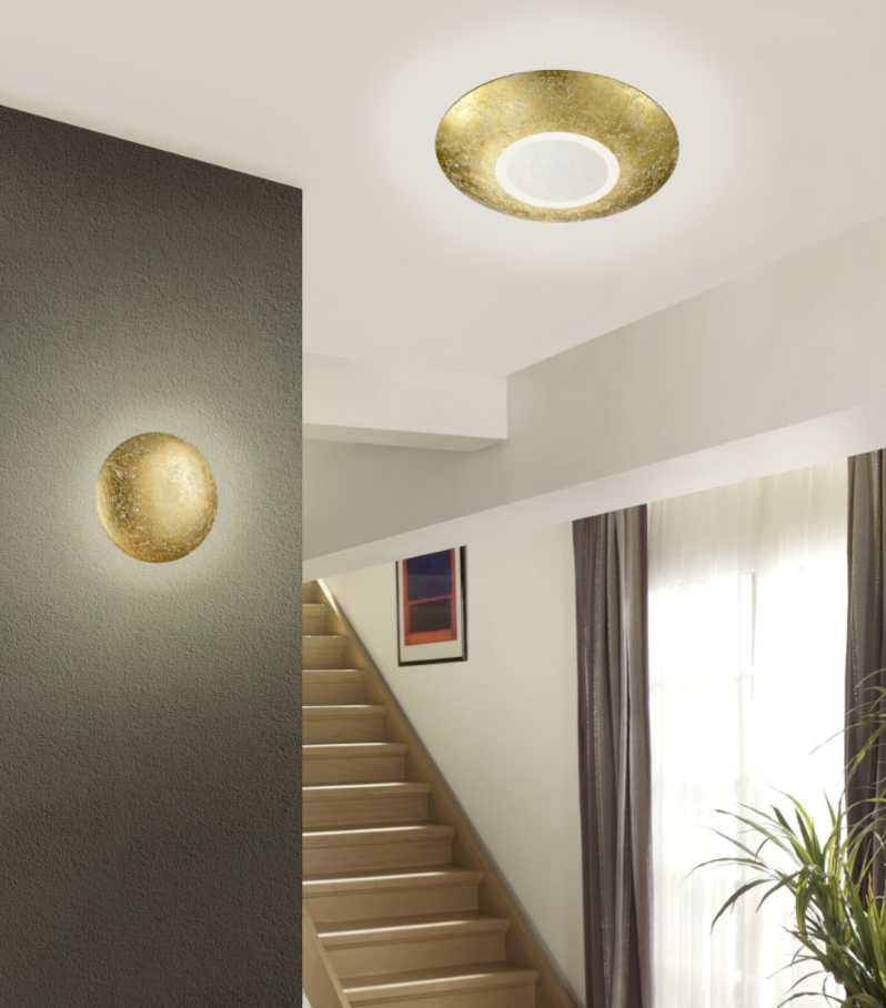 CHIROS - um candeeiro de teto com um aspeto antigo que cria um ambiente acolhedor na sala de estar ou no quarto. Emite uma luz branca quente para o teto e, ao mesmo tempo, para o ambiente circundante através do vidro no centro. O candeeiro tem um diâmetro de 32 cm. O design dourado cria um ambiente acolhedor e atmosférico. Além disso, a luminária possui a moderna tecnologia LED, que se caracteriza por uma elevada qualidade de luz e eficiência energética. Em comparação com as lâmpadas de halogéneo convencionais, é possível poupar até 80% dos custos de energia. Além disso, as fontes de luz LED têm uma longa vida útil, produzem menos calor e protegem o ambiente.