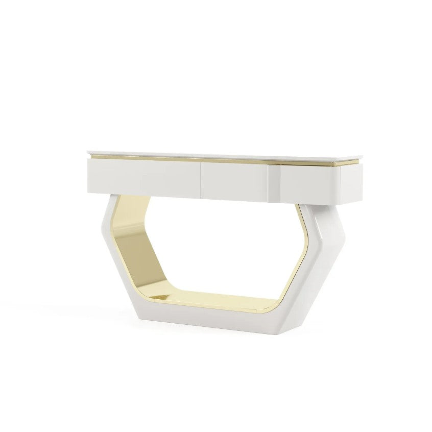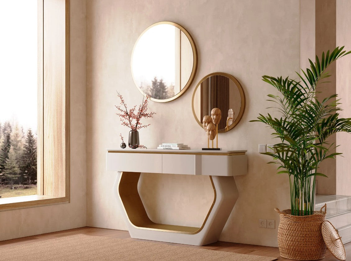 Consola em eucalipto e branco cetim, com detalhes em dourado. Esta é uma peça sofisticada e até um pouco futurista, ideal para dar um toque luxuoso à decoração do seu hall de entrada.