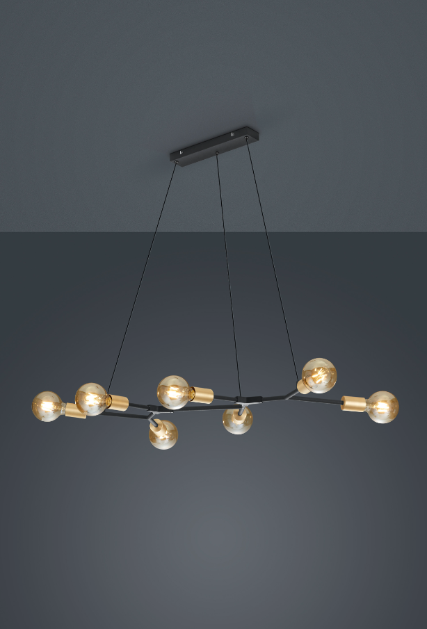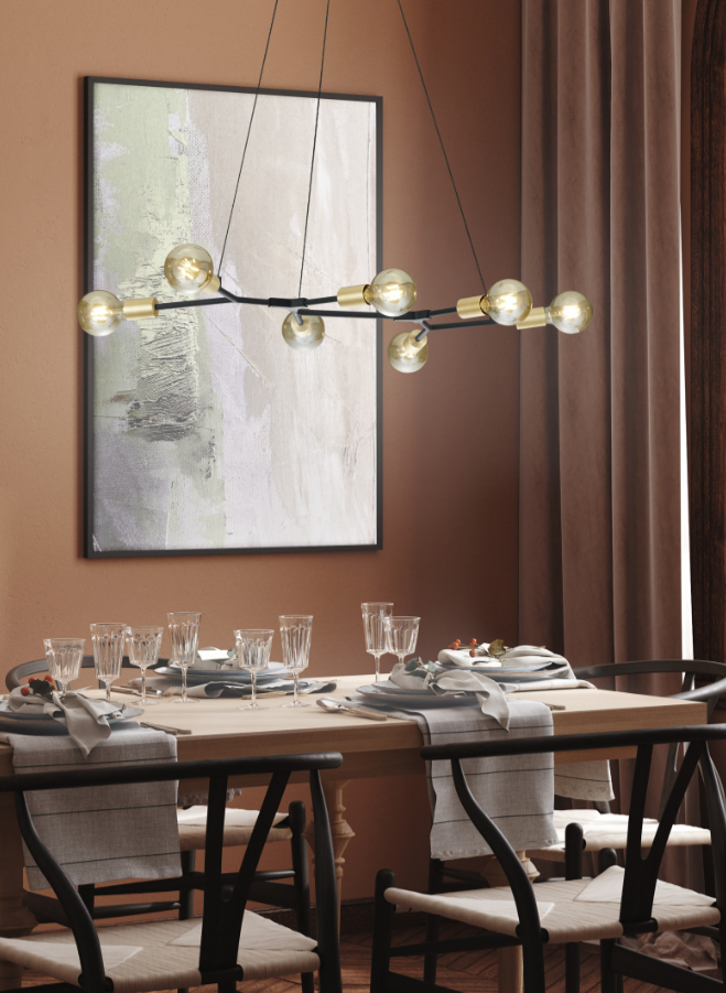Não convencional, criativo e orientado para o design. As luminárias minimalistas, como a série CROSS, dão um toque excitante e iluminam as divisões. A escolha de cores e formas cria contrastes - combinados de forma inteligente, criam um componente acolhedor e um ambiente elegante. A luminária é um complemento de bom gosto para quase todos os interiores e, com um comprimento de suspensão individual de no máx. 150 cm e uma largura de 100 cm, pode ser posicionada de forma ideal por cima de uma mesa de jantar grande ou na área de entrada. Para uma aparência harmoniosa, recomendamos a utilização de uma fonte de luz de incandescência, uma vez que tem uma visão direta da fonte de luz. A estrutura metálica simples e rectilínea em preto mate com suportes de lâmpadas cor de bronze cria um aspeto geral harmonioso. Para uma iluminação economizadora de energia, recomenda-se a utilização de uma lâmpada LED. Estas são uma óptima alternativa às lâmpadas de halogéneo convencionais e representam uma elevada qualidade de luz e uma poupança de energia de até 80%. Além disso, as lâmpadas LED ajudam-no a beneficiar de uma longa vida útil, de uma baixa produção de calor e, ao mesmo tempo, protegem o ambiente.