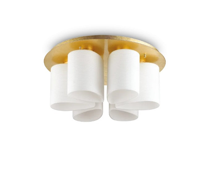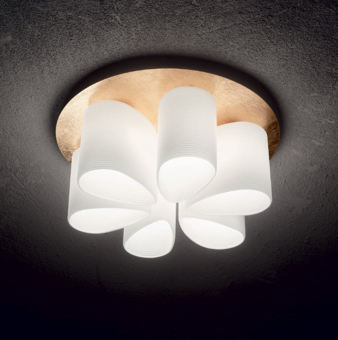 Base metálica com acabamento folheado a ouro. Difusores em vidro soprado branco com riscas em relevo. Ø 600 x H 255 mm E27 máx. 6 x 60 W