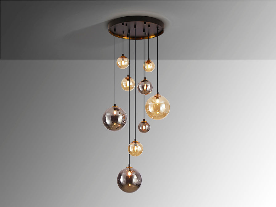 Candeeiro de 9 luzes realizado em metal com acabamento preto mate, com detalhes de latão acetinado. Abajures de vidro esféricos de 10, 12 e 20 cm, com acabamentos âmbar e cinzento smoke espelhado. Regulável em altura.