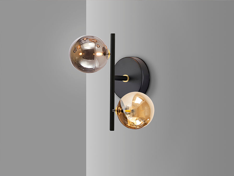Candeeiro de parede de 2 luzes realizado em metal com acabamento preto mate, com detalhe de latão acetinado. Abajures de vidro esférico âmbar e smoke de 12 cm.