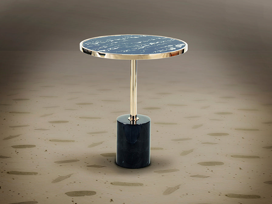 Mesinha auxiliar realizada em aço inoxidável acabamento dourado. Base de mármore preto e tampo de vidro temperado acabamento imitação mármore preto.