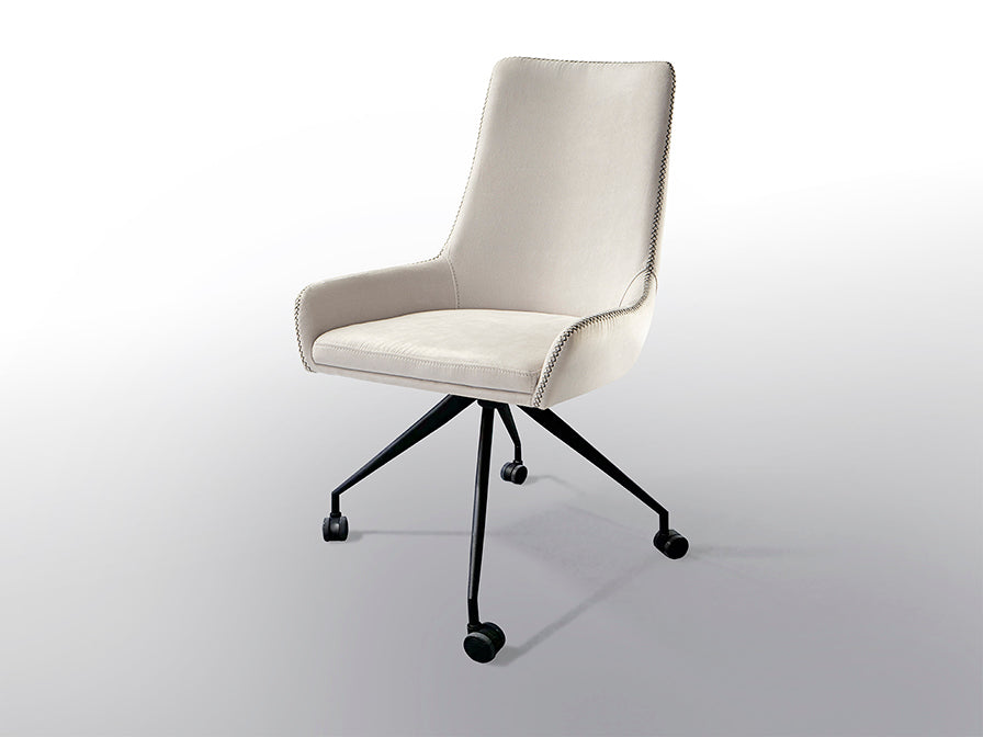 Cadeira com rodas giratórias, realizada em metal, acabamento preto mate. Forro em tecido 100% poliéster em cor branca, com pesponto decorativo em cinzento.