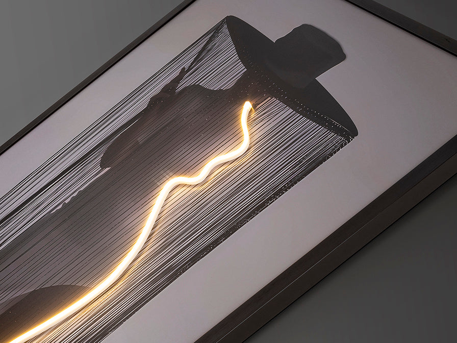 Figura de mulher com chapéu de aba larga, composição com fita de luz LED decorativa. Tela impressa, colada sobre placa e emoldurada a preto.