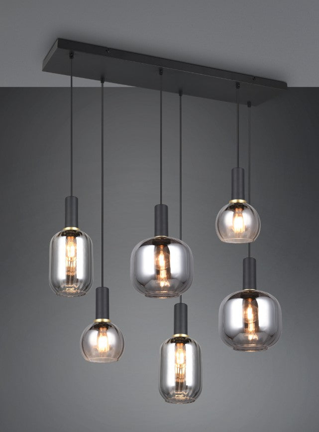 Os versáteis abajures de vidro das luminárias pendentes da gama DIVA conferem um encanto especial ao seu interior. Sobre mesas de jantar, mesas de café ou balcões de cozinha, são um atrativo impressionante que atrai a atenção de todos. A forma e o design especiais do vidro difundem suavemente a luz e o reflexo cria um jogo de luz acolhedor. Este ambiente luminoso acolhedor, aliado ao design intemporal, fará com que DIVA se torne rapidamente um favorito na sua casa. A combinação glamorosa de preto mate e vidro cromado confere à luminária de seis luzes um aspeto elegante e discreto. A utilização de fontes de luz LED é recomendada para uma iluminação economizadora de energia. Estas são uma alternativa ideal às fontes de luz de halogéneo convencionais e oferecem uma elevada qualidade de luz e uma poupança de energia até 80%. Com as fontes de luz LED, também beneficia de uma longa vida útil e de uma baixa produção de calor, protegendo o ambiente.