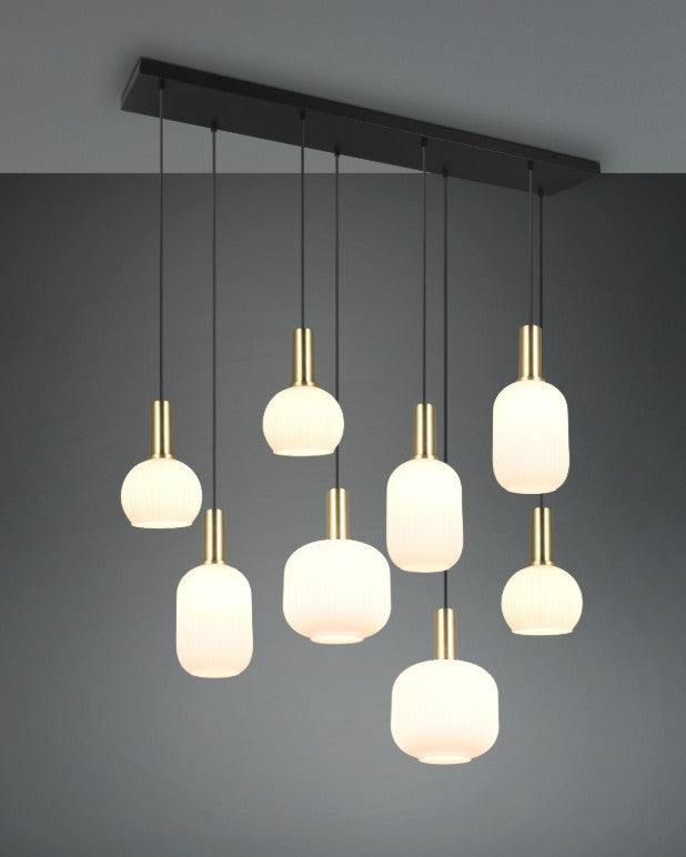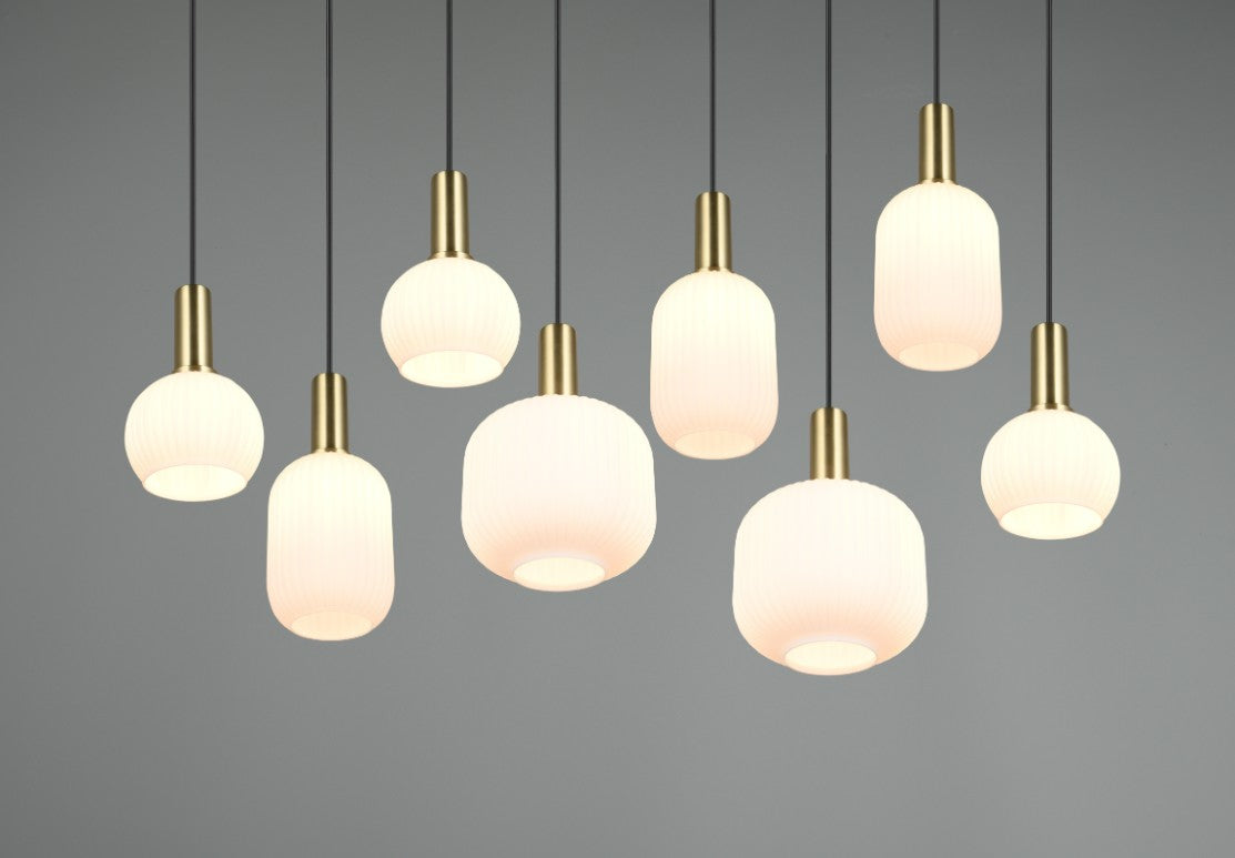 Os versáteis abajures de vidro das luminárias suspensas da gama DIVA conferem um encanto especial ao seu interior. Suspensos por cima de uma mesa de jantar, mesa de café ou balcão de cozinha, são um atrativo impressionante que atrai a atenção de todos. A forma e o design especiais do vidro difundem a luz de forma suave e sem reflexos, criando um jogo de luz acolhedor. Este ambiente luminoso acolhedor, aliado ao design intemporal, fará com que o DIVA se torne rapidamente um favorito na sua casa. A combinação glamorosa de latão mate e vidro opalino branco confere ao candeeiro de oito lâmpadas um aspeto elegante e discreto.