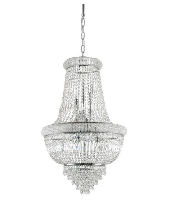 Estrutura em metal cromado ou dourado. Elementos decorativos compostos por cristais transparentes, pérolas, octógonos e prismas.