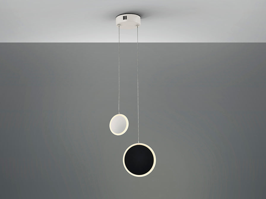 Candeeiro formado por dois discos suspensos com luz perimetral. Realizado em metal acabamento branco e preto mate. Difusor acrílico opalino. 9W LED. 530 lm. 3000k