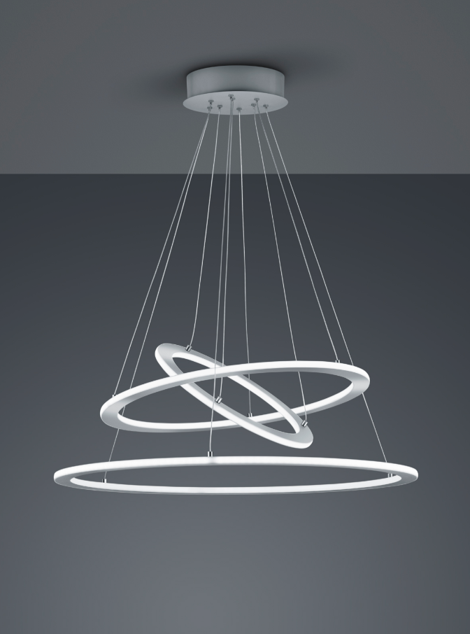 Dê um toque de estilo com a moderna luminária suspensa DURBAN. O design elegante da luz atrai a atenção de todos e optimiza o estilo de vida moderno. O regulador de intensidade SWITCH integrado permite selecionar três níveis de luminosidade diferentes utilizando um interrutor de luz convencional. Ao graduar a intensidade da luz de 100% para 50% e 25%, a luminária pode ser adaptada a diferentes necessidades. A luminária pendente é composta por três anéis, o anel inferior tem um diâmetro de 80 cm, o anel exterior dos dois anéis interligados tem um diâmetro de 60 cm e o anel interior 40 cm. O esquema de cores em níquel mate também permite uma grande variedade de combinações com interiores e cores existentes. Além disso, a luminária possui a moderna tecnologia LED, que se caracteriza por uma elevada qualidade de luz e eficiência energética. Em comparação com as lâmpadas de halogéneo convencionais, é possível poupar até 80% dos custos de energia. Além disso, as fontes de luz LED têm uma longa vida útil, produzem menos calor e protegem o ambiente.