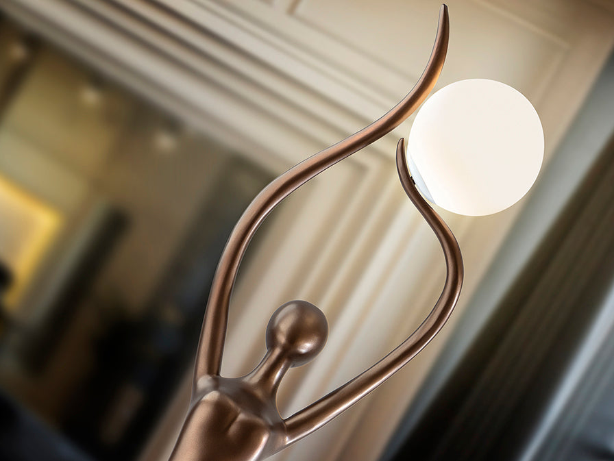 Figura realizada em fibra de vidro e resina de poliéster, acabamento bronze escuro, base metálica preto mate. Abajur esférico em acrílico com acabamento opalino mate.