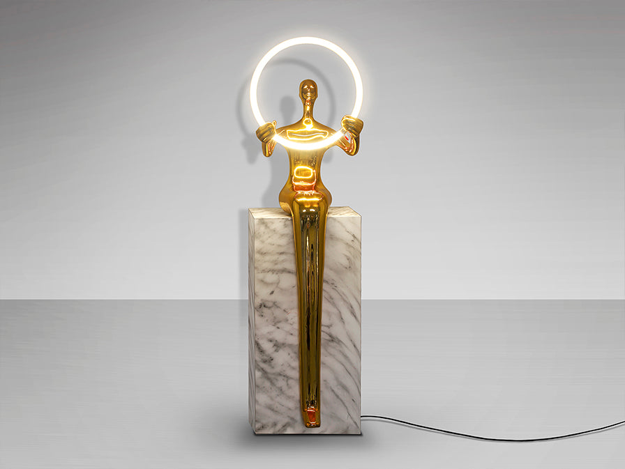 Figura realizada em fibra de vidro e resina de poliéster, acabamento banho dourado brilhante. Pedestal de grés porcelânico tipo mármore branco. Aro de acrílico opalino com luz LED. 3,2W LED, 360 lm, 3000 k.