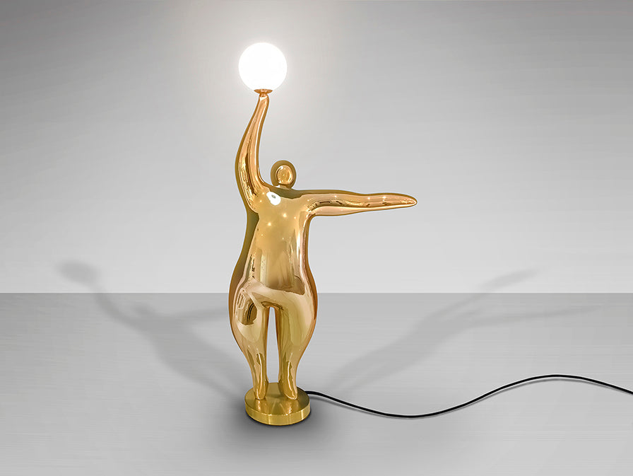 Figura realizada em fibra de vidro e resina de poliéster, acabamento banho dourado brilhante, abajur esférico de acrílico, acabamento opalino mate.