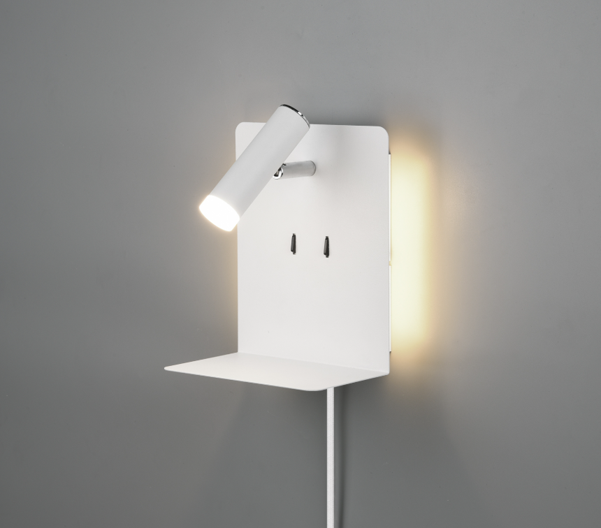 Intemporal e minimalista. A luminária de parede ELEMENT tem um design simples e elegante. A luminária mede 20 x 16 cm e tem duas fontes de luz que podem ser accionadas separadamente através de interruptores integrados. O candeeiro de leitura ELEMENT pode ser alinhado individualmente e, por isso, é ideal como candeeiro de parede ao lado da cama. A luminária de parede também tem uma prateleira e uma porta USB com função de carregamento, para que os dispositivos electrónicos possam ser facilmente guardados e carregados ao mesmo tempo. Além disso, graças à função FLEXconnect, a luminária é adequada tanto para ligação fixa como para utilização com um cabo de alimentação. O esquema de cores branco mate permite uma grande margem de combinação com conceitos de cores existentes e completa qualquer estilo de mobiliário simples.