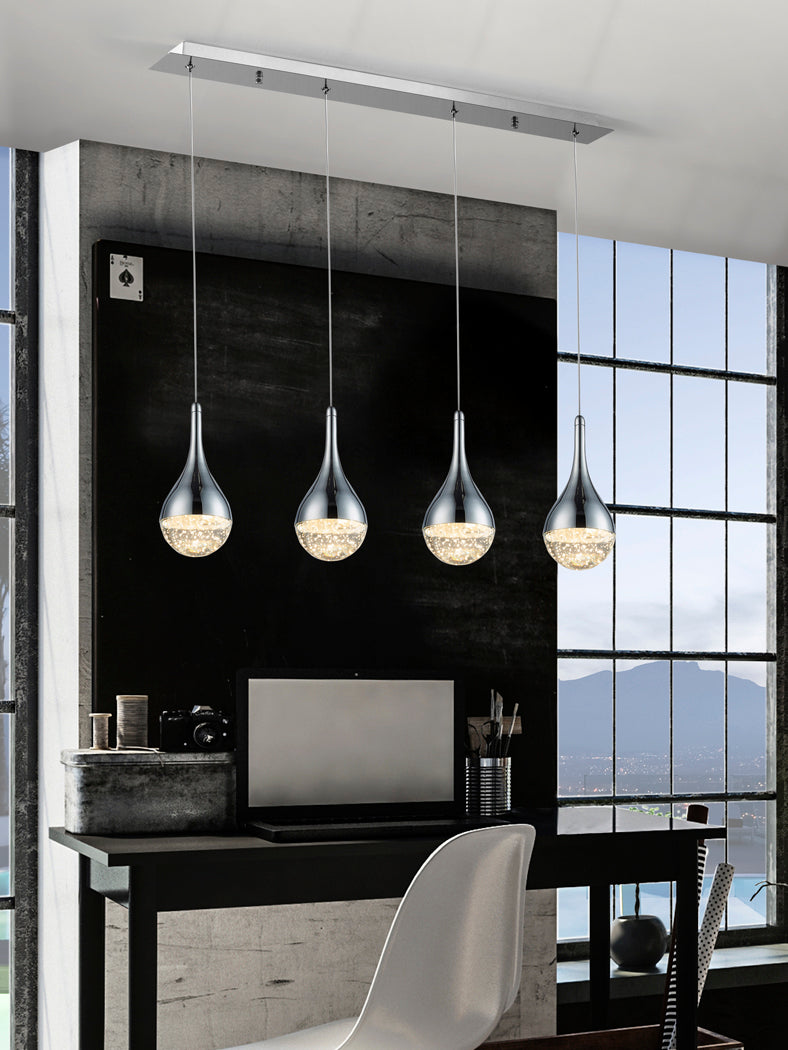Candeeiro de 4 luzes LED, em metal, acabamento crómio. Tulipas em forma de gota realizadas em vidro maciço com bolhas decorativas no seu interior. Reguláveis em altura. 4x5W LED. 1 600 lm. 3 000 K.