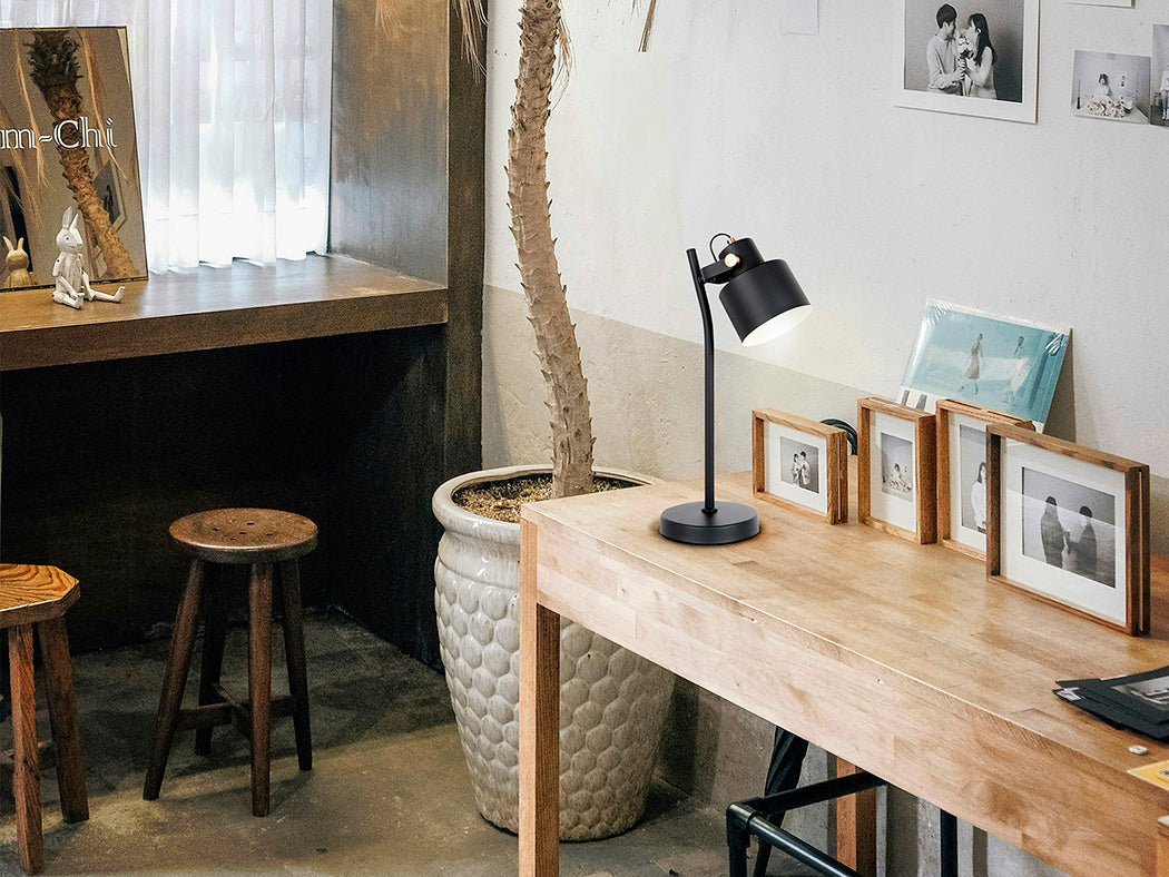 Candeeiro de secretária realizado em metal com acabamento preto mate, com detalhes em cobre acetinado. Tela com inclinação regulável. 1 E27.