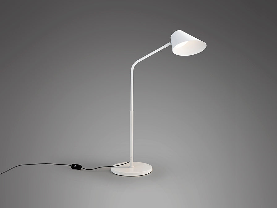 Candeeiro de secretária, realizado em metal e alumínio, acabamento branco mate, difusor opalino. Botão tátil e CONTROLO REMOTO. Projetor regulável, luz regulável, temperatura de cor regulável. 12W LED, 1300 lm, CCT 3000K-6500K.