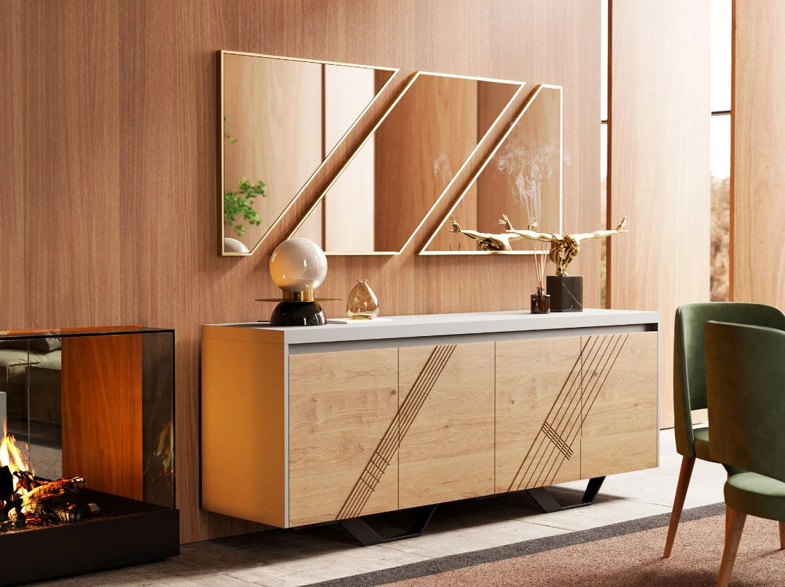 Espelho grande com moldura. A sua assimetria e subdivisão fazem dele uma peça sofisticada e capaz de trazer vida a qualquer divisão.