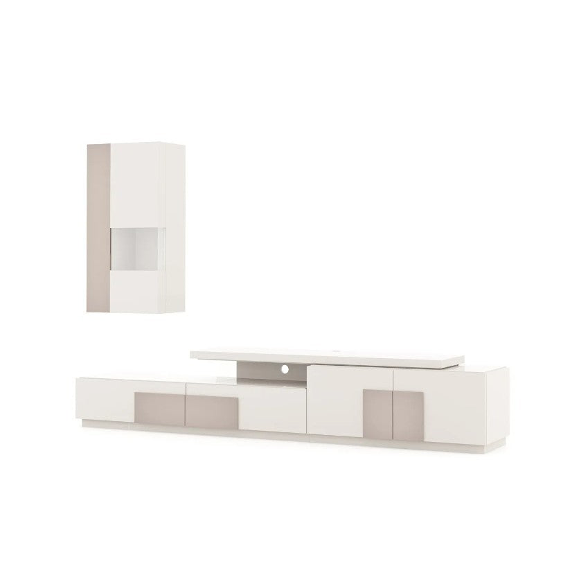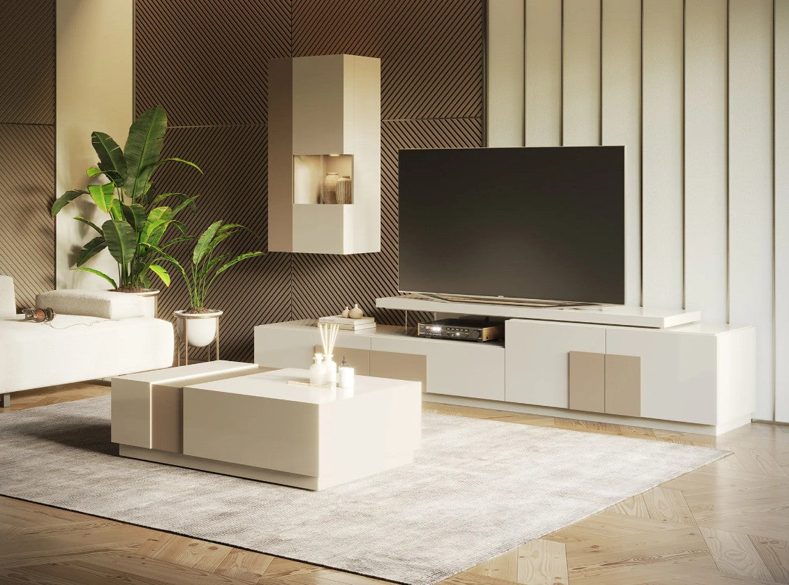 Estante de TV branca, com detalhes em metalizado terra e um design moderno e elegante. Na sua base de TV, além de colocar a televisão, existe um compartimento onde pode inserir a Box de TV. Junto a esta Estante temos uma Vitrine Suspensa, ideal para colocar pequenos objetos decorativos.