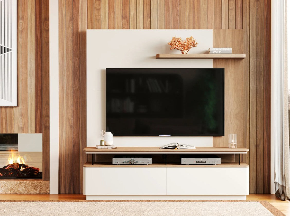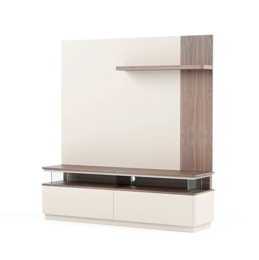 Estante de TV em nogueira e tons neutros, vai ser o destaque principal da sua sala de estar. Apresenta dois compartimentos para arrumação ou para colocar as suas boxes de TV.
