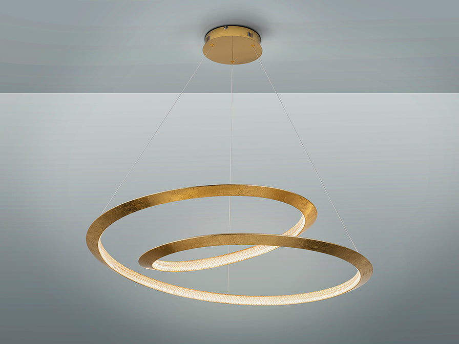 Candeeiro realizado em metal, perfil curvo acabamento folha de ouro e dossel dourado. Difusor de peças de acrílico transparente. 64W LED. 3588 lm. 3000K.