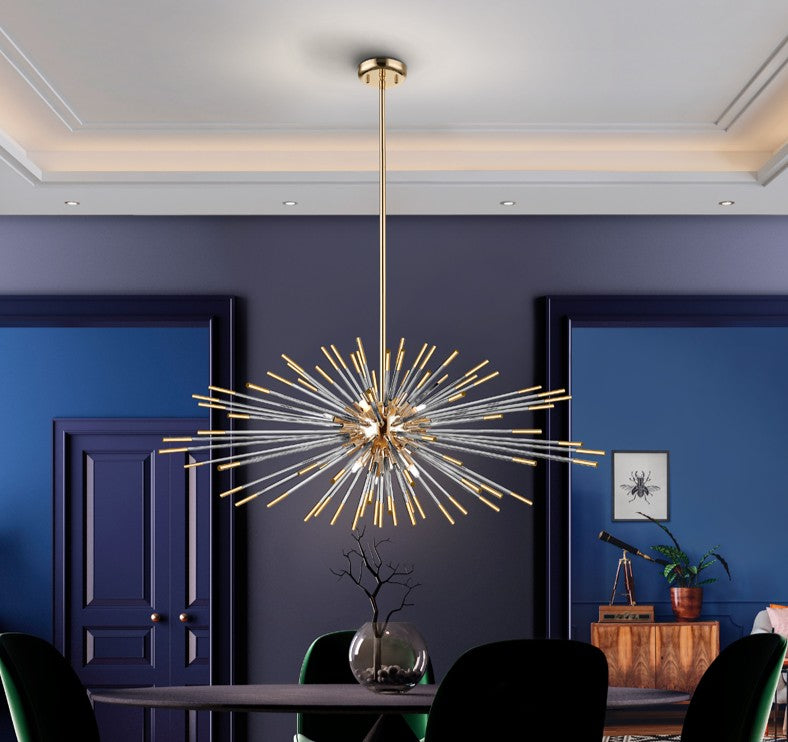 Candeeiro esferoidal realizado em metal acabamento dourado brilho. Varetas radiais de vidro transparente com as pontas decoradas em âmbar. Altura regulável.
