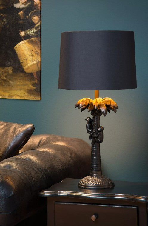 Combinar um candeeiro de mesa funcional com um toque interior divertido e extravagante? Extravaganza Coconut faz isso por você. Uma cena exótica se desenrola sob o abajur de algodão de aparência clássica. Dois chimpanzés escalam uma palmeira. Um avidamente colhe cocos enquanto o outro, macaco menor, observa com aprovação. A copa da árvore é adicionalmente iluminada pela lâmpada, que espalha sua luz de forma difusa. A lâmpada de plástico tem meio metro de altura e é compatível com uma lâmpada LED. Você pode facilmente ligar e desligar a luz com o interruptor no cabo. Aprecie o espetáculo e o novo atrativo em seu interior.