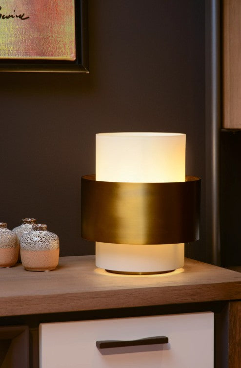 O criador de humor ideal para a sua cómoda, mesa de cabeceira ou secretária? Firmin se encaixa em todos os lugares. Desde que um toque retrô seja bem-vindo. Este elegante candeeiro de mesa espalha um brilho quente onde quer que o coloque. Você pode facilmente ligar e desligar o Firmin com um interruptor no cabo. A lâmpada combina um cilindro de vidro opalino com um cinto de latão. Com suas dimensões sutis de 20 centímetros de comprimento e 23,5 centímetros de altura, Firmin é muito flexível no uso.
