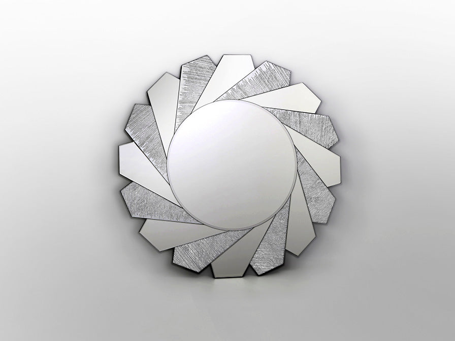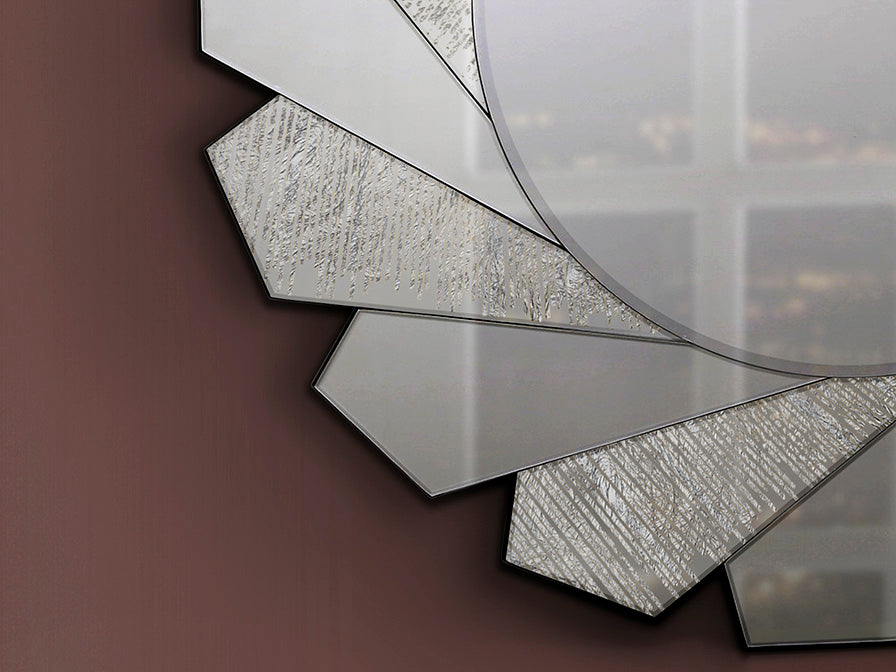 Espelho com lua central biselada e moldura de vidro com grafismo em FOLHA DE PRATA. Traseira de DM lacado em preto.