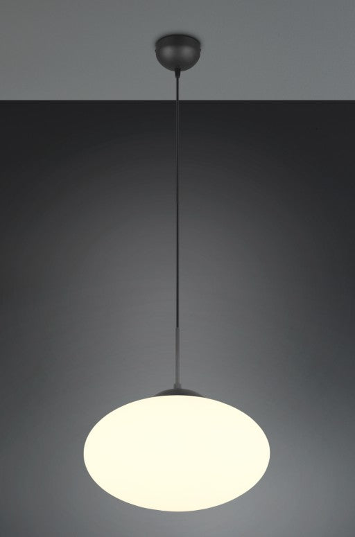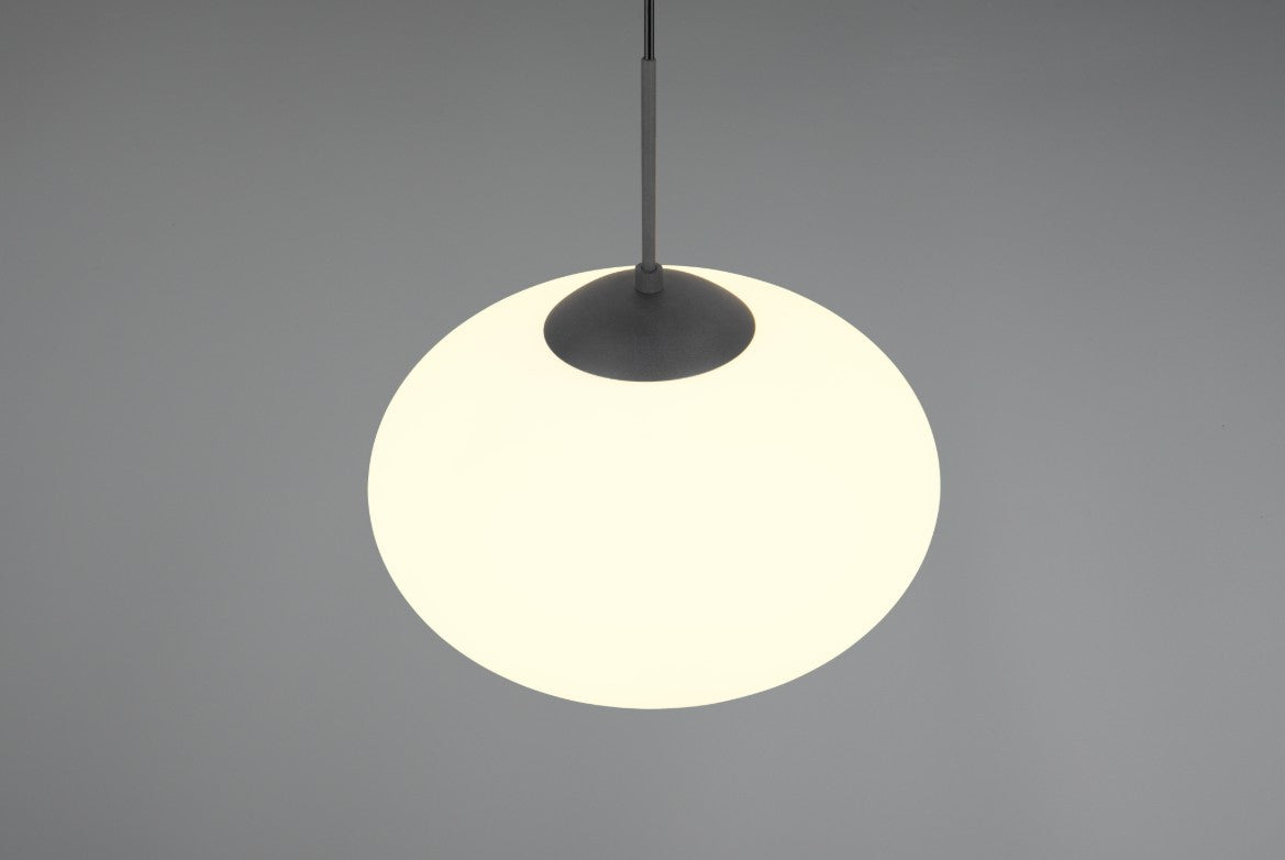 O candeeiro suspenso FOMENTO cria um toque suave por cima da mesa de jantar ou da sala de estar. A elegante cabeça de luz elipsoidal em vidro opalino dá um toque especial à luminária e distribui a luz de forma agradável pelo ambiente. A combinação de vidro preto mate e branco cria um toque de elegância e sofisticação ao mesmo tempo. A utilização de fontes de luz LED é recomendada para uma iluminação economizadora de energia. Estas são uma alternativa ideal às fontes de luz de halogéneo convencionais e oferecem uma elevada qualidade de luz e uma poupança de energia até 80%. Com as fontes de luz LED, também beneficia de uma longa vida útil e de uma baixa produção de calor, protegendo o ambiente.