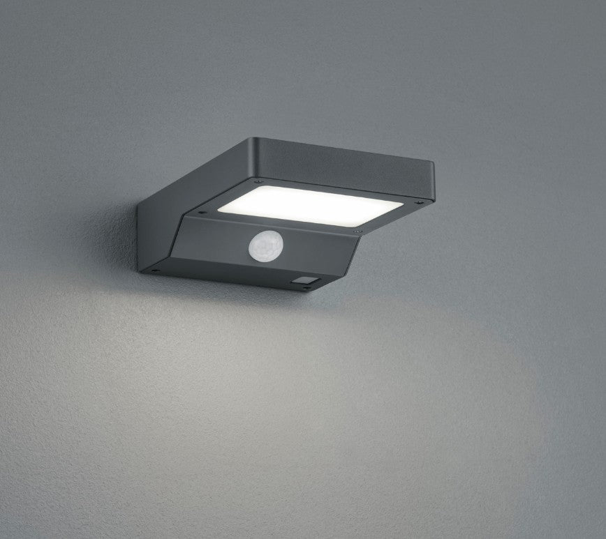 Candeeiros solares - uma alternativa conveniente a uma ligação eléctrica fixa e uma luz ideal para a casa e o jardim. Graças ao painel solar do candeeiro de exterior FOMOSA, a luz do sol pode ser captada e convertida em eletricidade. São extremamente ecológicos, económicos e igualmente práticos, uma vez que não necessitam de tomadas nem de ligação à rede eléctrica. Para uma iluminação óptima, o candeeiro de exterior LED está equipado com um sensor de movimento com um ângulo de deteção de 90 graus e um alcance de 5 a 8 metros. A duração da luz do sensor é de cerca de 40 segundos. Com proteção IP44, a luminária de parede de 4,5 x 12,5 cm está protegida contra salpicos de água e é, por isso, adequada para utilização no exterior. A luz solar tem uma duração de luz de 2,5 horas com um tempo de carregamento de cerca de 8 horas. O design de cor antracite pode ser combinado de várias formas e garante um aspeto moderno.