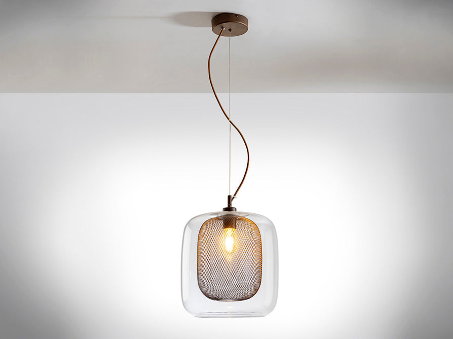 Candeeiro de 1 luz grande realizado em metal lacado, cor chocolate. Dupla tulipa, interior de rede metálica e exterior de vidro.