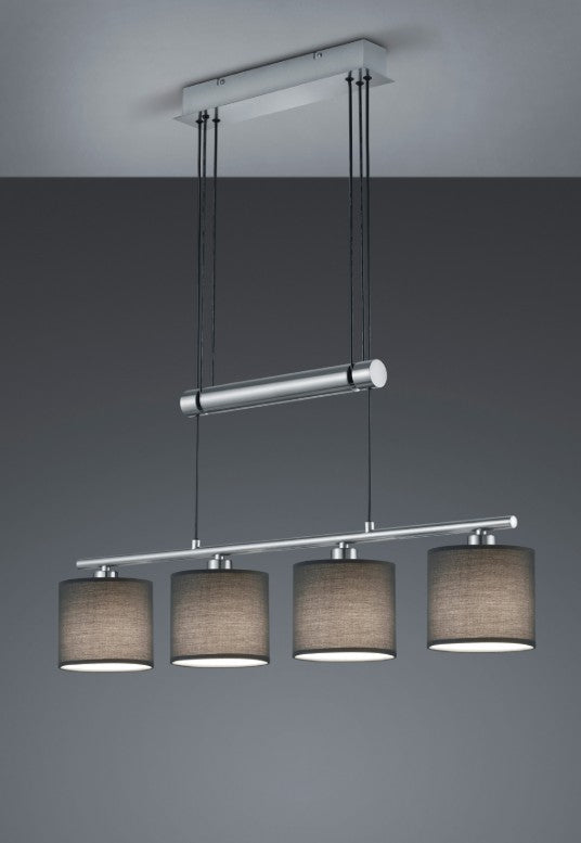 Um herói absoluto do quotidiano e, ao mesmo tempo, um acessório decorativo para a casa. O candeeiro suspenso GARDA de quatro luzes pode ser ajustado em altura para se adaptar às suas necessidades e circunstâncias. Por conseguinte, pode ser colocada por cima de qualquer mesa de jantar para proporcionar uma iluminação óptima. O comprimento da suspensão pode variar entre 95 cm e 150 cm. Tem uma largura de 77 cm e uma profundidade de 13,5 cm. A estrutura metálica em níquel mate e os tons de tecido em cinzento harmonizam-se particularmente bem e combinam com um estilo de mobiliário simples e moderno.