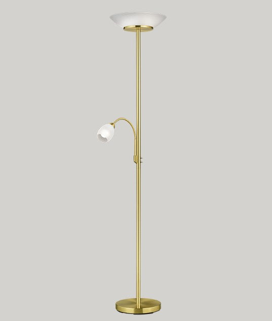 Design simples e modernidade intemporal. O projetor GERRY oferece inúmeras opções de aplicação e combinação. Idealmente, a luminária deve ser posicionada junto ao sofá, uma vez que um braço de leitura flexível garante o melhor resultado de iluminação possível, para além da luz de teto como fonte de luz principal. Esta pode ser direccionada de forma orientada para que o padrão de luz desejado possa ser selecionado livremente. O projetor tem uma altura de 180 cm e um diâmetro de 34 cm. Graças ao design clássico da cor em latão mate, o candeeiro pode ser combinado com muitos estilos de mobiliário. Para uma iluminação economizadora de energia, recomenda-se a utilização de uma lâmpada LED. Estas são uma óptima alternativa às lâmpadas de halogéneo convencionais e representam uma elevada qualidade de luz e uma poupança de energia de até 80%. Além disso, as lâmpadas LED ajudam-no a beneficiar de uma longa vida útil, de uma baixa produção de calor e, ao mesmo tempo, protegem o ambiente.