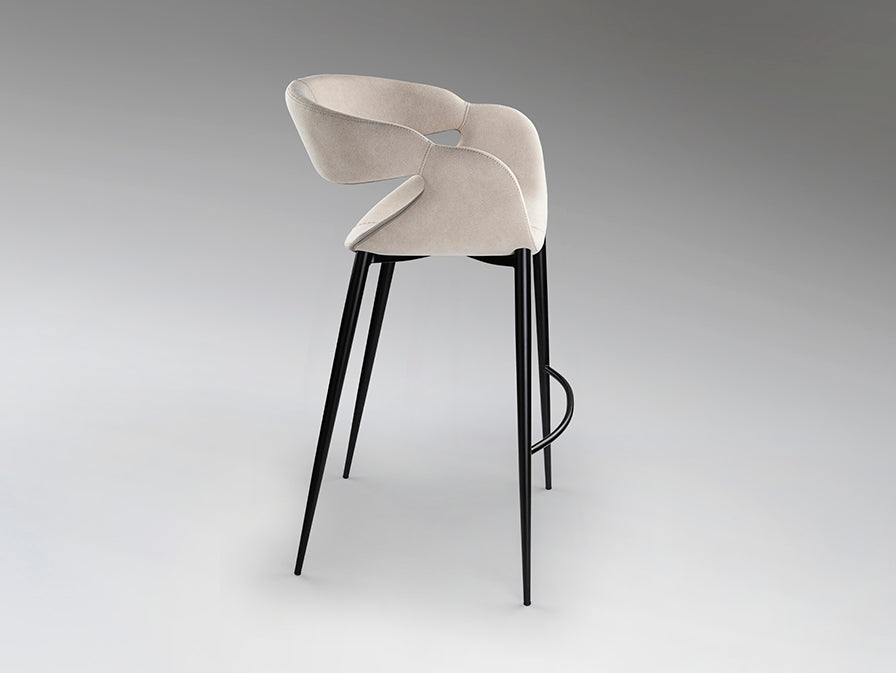 Banco alto. Pés metálicos em acabamento preto mate com apoio para os pés de aço polido. Assento e encosto de madeira contraplacada e espuma. Forro em tecido de poliéster 100% em cor pedra clara, com pesponto decorativo. Limpeza a seco.