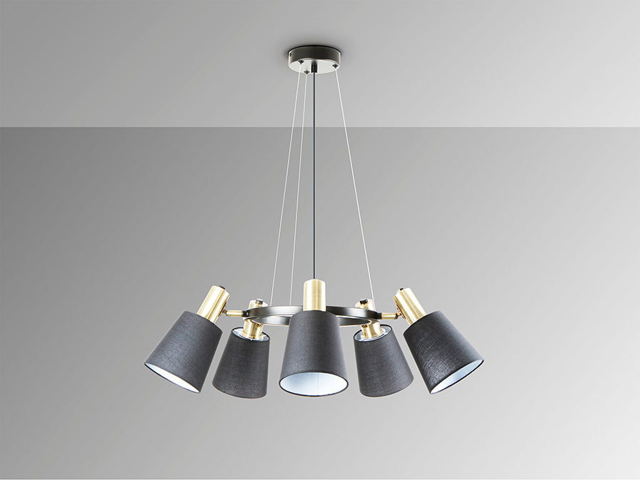 Candeeiro de 5 luzes realizado em metal com acabamento preto mate e detalhes em latão acetinado. Tela em tecido preta com inclinação regulável. Altura regulável. 5 E27.