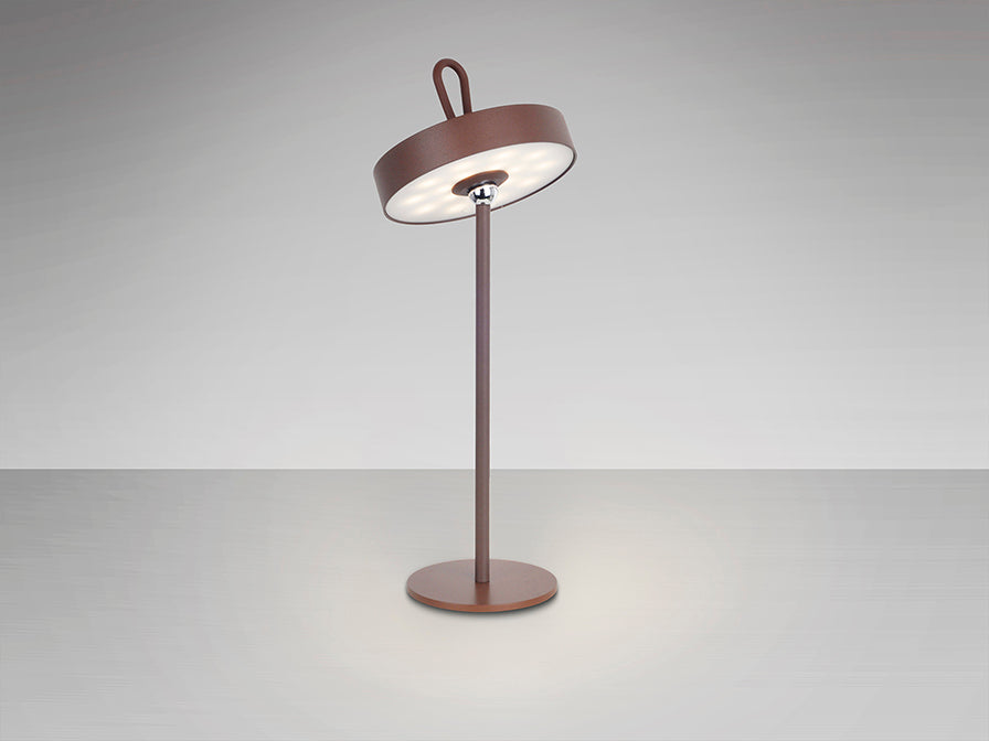 Candeeiro de secretária LED para interior e exterior, inclui acessórios magnéticos para utilização como aplique ou suspenso. Realizado em metal com acabamento corten e difusor em acrílico opalino. 2,5W LED, 140 lm, 3000 K. REGULÁVEL. IP54.