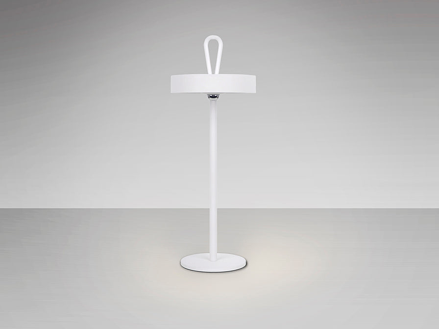 Candeeiro de secretária LED para interior e exterior, inclui acessórios magnéticos para utilização como aplique ou suspenso. Realizado em metal com acabamento branco e difusor em acrílico opalino. 2,5W LED, 140 lm, 3000 K. REGULÁVEL. IP54.