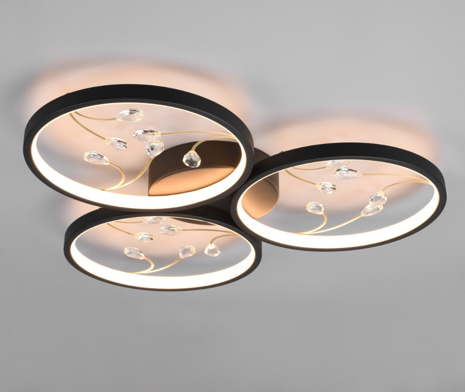 Os três círculos luminosos do candeeiro de teto GROOVY evocam aquele toque especial na sua sala de estar. Os finos elementos de vidro dentro dos círculos dão um toque elegante e tornam-se um verdadeiro elemento decorativo no seu teto. Um regulador de intensidade SWITCH integrado permite regular a luminosidade dos LED incorporados em três níveis através de um interrutor de luz. O aspeto perfeitamente modelado em preto mate integra-se em muitos estilos de interiores graças à sua simplicidade.