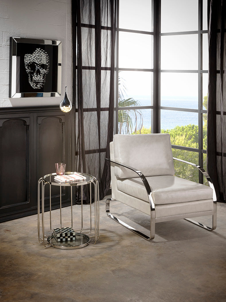 Mesinha auxiliar redonda, realizada em aço acabamento brilho. Tampo e estante inferior de vidro temperado de 5 mm.