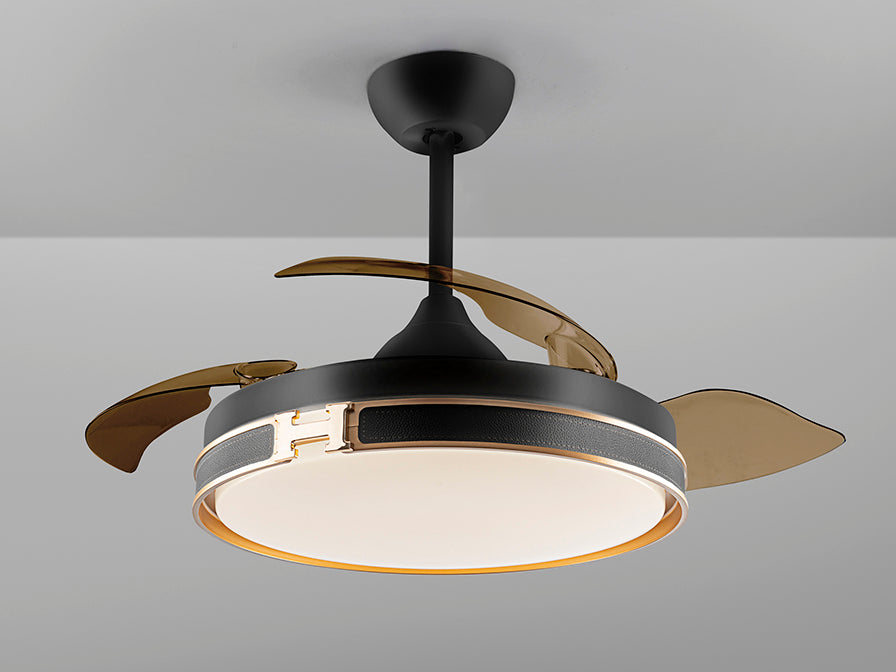 Ventoinha de teto com luz LED REGULÁVEL CCT, 3 tons de luz. Motor DC: 6 velocidades, inversão, temporizador. Corpo em metal acabamento preto mate. Aro em acrílico dourado e polipele preta. Difusor opalino e lâminas escamoteáveis transparentes. Controle remoto incluído. LED 36W, 2880 lm, 3000-6000 K. Ventilador: Hélice de 3 pás, Ø107 cm estendido. Raio de ação: Ø180 cm (medido 140 cm abaixo do ventilador). Motor CC de 35W. 6 velocidades. Fluxo de ar (207/356/504/652/800/964 m3/h). Movimento reverso. Rumor: 37/45Db. Componentes CE.
