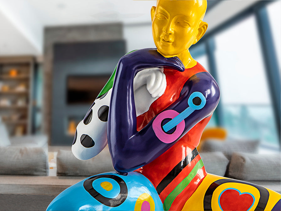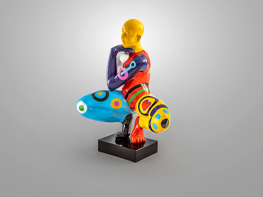Figura de homem, tamanho médio, realizada em resina. Decoração POP.