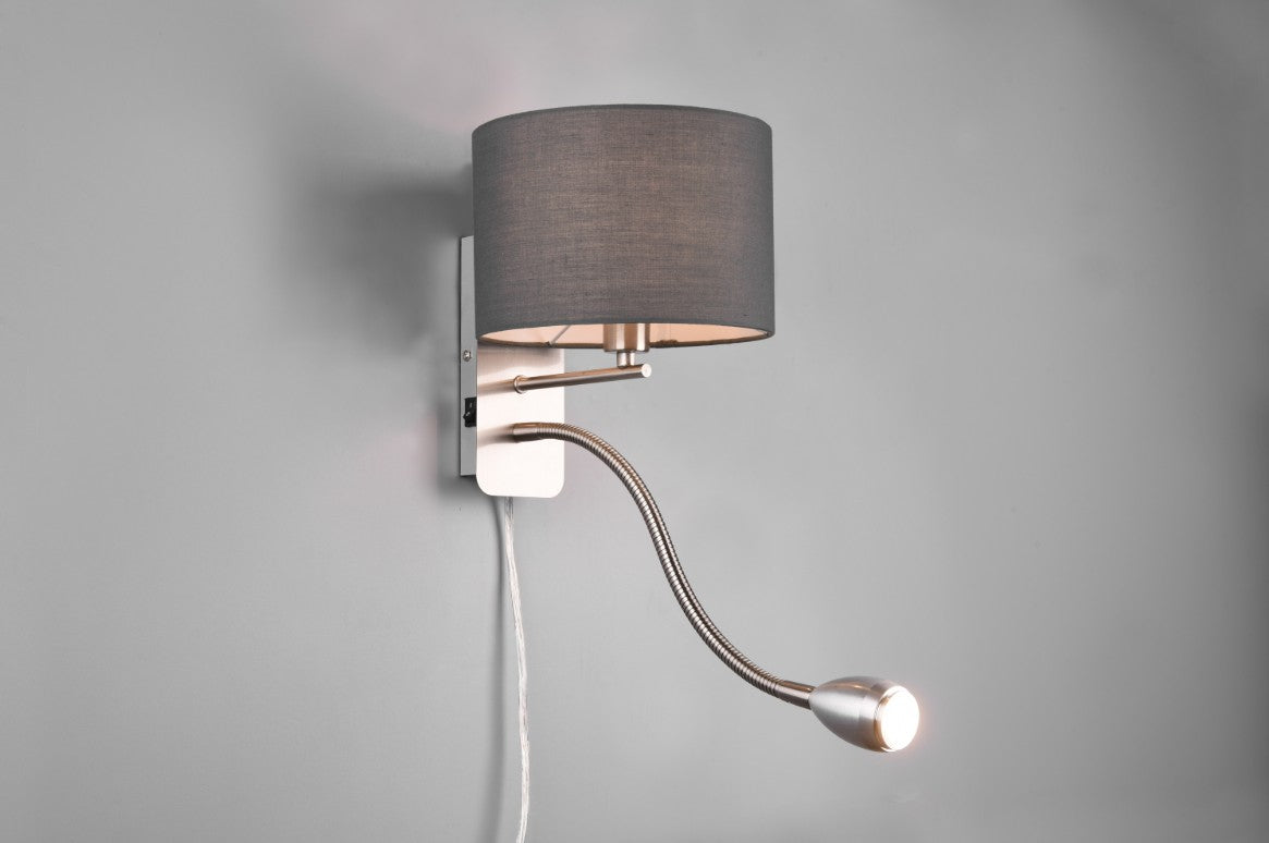 As luminárias com abajures têxteis criam um ambiente atmosférico e acolhedor. A luz é emitida suavemente para o ambiente através do abajur de tecido, criando uma atmosfera acolhedora. O candeeiro de parede HOTEL é adequado como alternativa ao clássico candeeiro de cabeceira. Porque o prático braço de leitura pode ser alinhado individualmente pelo braço flexível. Dois interruptores na parte lateral do candeeiro permitem que o abajur principal e o braço de leitura sejam ligados separadamente. A forma simples do candeeiro transmite um ambiente agradável e é considerado um clássico da iluminação decorativa. Devido à combinação de bom gosto do tom cinzento com o níquel mate, o candeeiro cria um ambiente moderno.