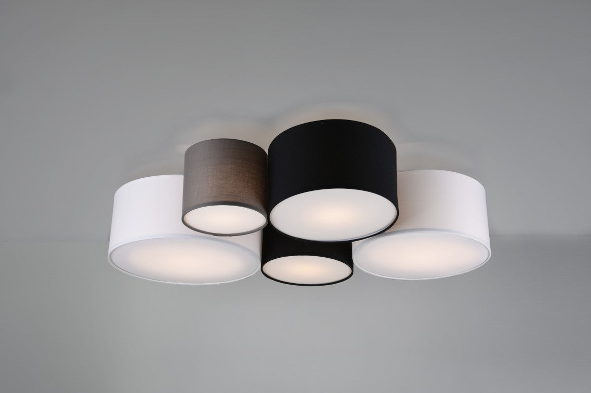 Os candeeiros de tecido criam um ambiente acolhedor e são considerados um clássico da iluminação decorativa. O candeeiro de teto de cinco luzes é particularmente eficaz em áreas de estar e de dormir. Proporciona uma iluminação harmoniosa e dá à sua casa um ambiente acolhedor. Dois tons de tecido branco, dois pretos e um cinzento criam uma combinação harmoniosa que pode ser utilizada de várias formas.