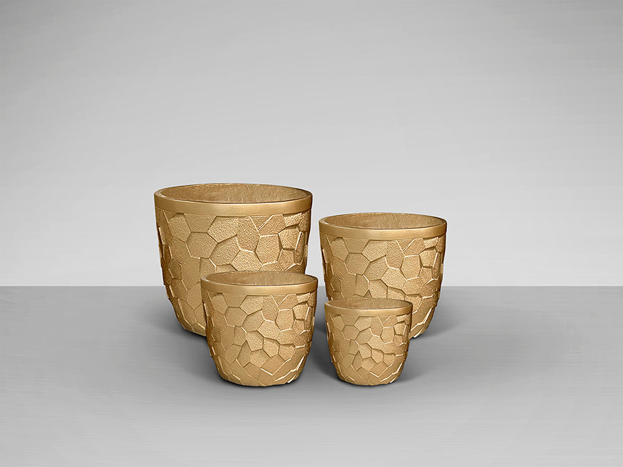 Set de quatro floreiras realizadas em fibra de vidro e resina Fiberclay, acabamento em dourado. Gde. Ø44x40 cm. Méd. Ø37x31 cm. Peq. Ø30x26 cm. Mini Ø24x22 cm.